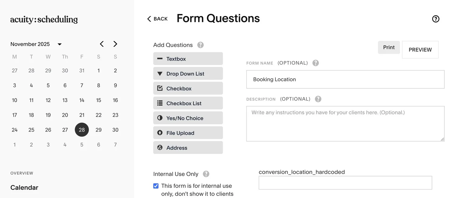 1) Head over to Acuity Scheduling -> Intake Form Questions -> New Custom Form