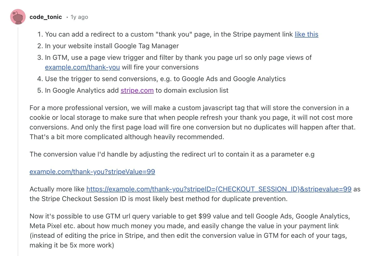 A year ago I answered a question on Reddit regarding how to track Stripe payment links with Google Tag Manager.
